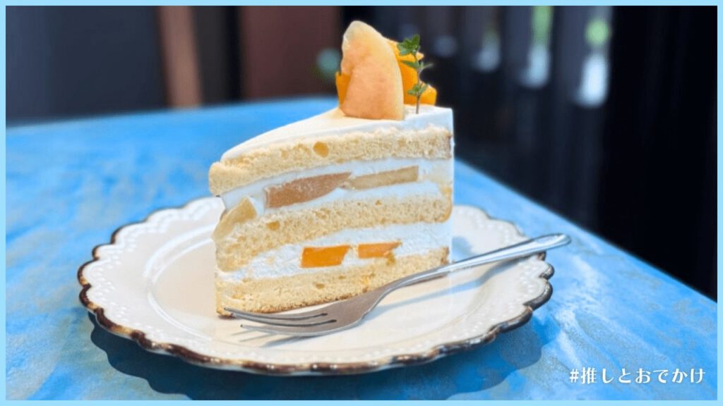 白桃とマンゴーの甘さがそれぞれ引き立つ、フルーツ感たっぷりのショートケーキ。