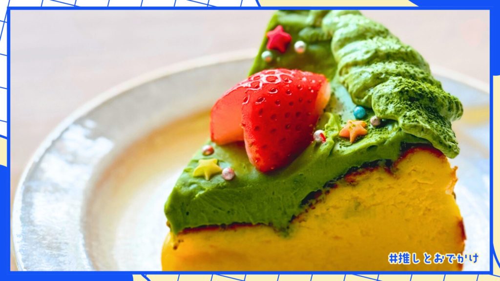 濃いグリーンの抹茶クリームが一面を覆い、赤いいちごとカラフルな星のスプリンクルが散りばめられたクリスマス限定スイーツ。