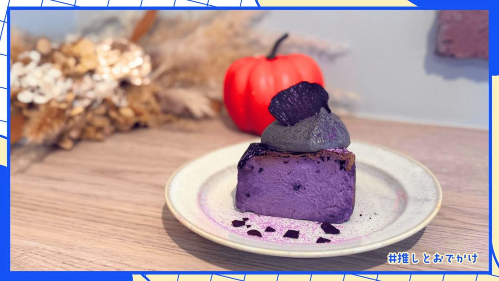 鮮やかなパープルのケーキに、紫芋チップスがのった、見た目のインパクトが大きい一品。